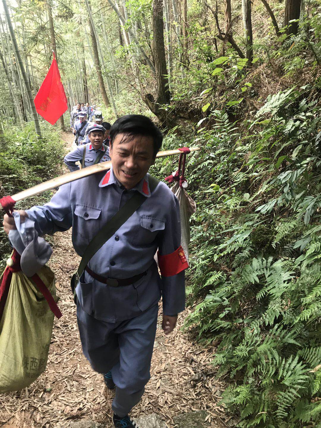 紅軍挑糧小道是井岡山近年來新開發的的一條徒步體驗式線路。這條山路原是1928年紅軍從寧岡縣、茅坪鄉、大隴鎮一帶挑糧上山路線的一小段,小道全長3100多米,山上海拔1300多米,垂直高差約400米,甚是陡峭。當年42歲的朱德和35歲的毛澤東在公務繁忙的情況下,毅然拿起扁擔,帶領紅軍指戰員肩挑背馱地把30多萬斤糧食運上了井岡山,解決了紅軍給養問題,支撐了割據井岡山工農武裝的革命斗爭。學員們著紅軍裝行走在挑糧小道上,董事長段志春帶頭挑擔,小道崎嶇、陡峭、狹窄、彎曲,學員們在艱難的前行中,仿佛依舊可以感受到革命先烈腳板的余溫,感受著當年紅軍的革命熱情。