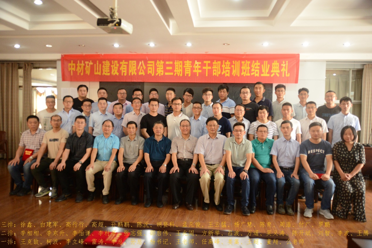 2019年7月20日,中材礦山建設有限公司第三期青年干部培訓班結業典禮在武漢理工大學資環學院報告廳舉行,資環學院楊書記、中材礦山孫總、培訓班負責人王玉杰教授及有關領導、老師出席,典禮由任高峰主持。